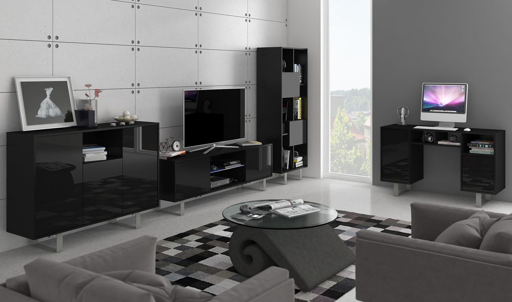 - Fronty mebli wykonane są na połysk (biały oraz czarny)