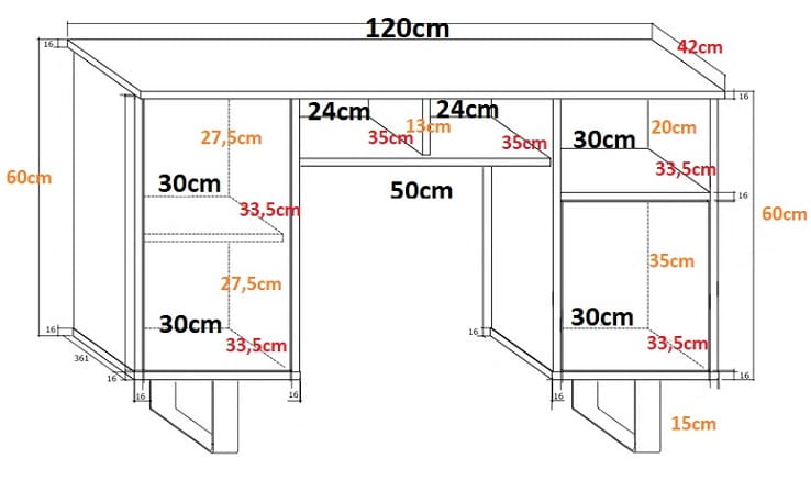 Biurko składa się z 3 otwartych półek oraz 3 zamkniętych.