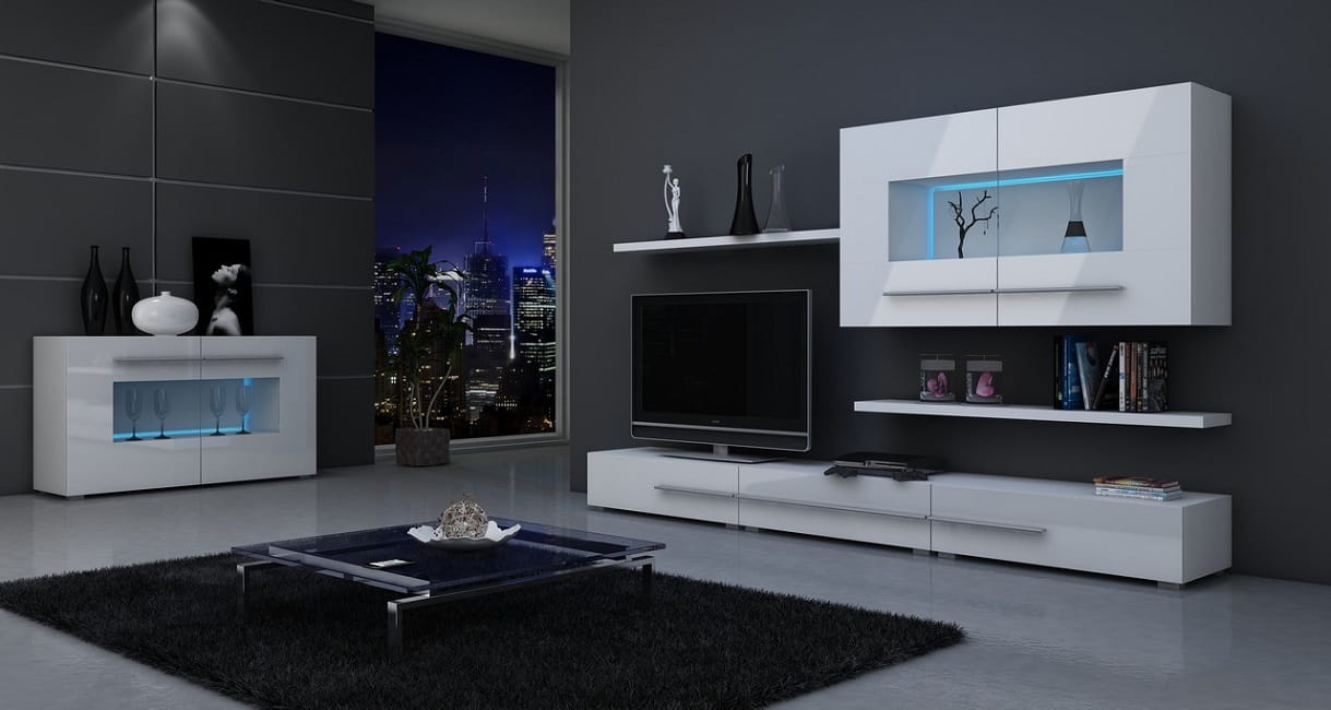 Nowoczesna meblościanka KOLN w zestawie z przeszkloną witryną.