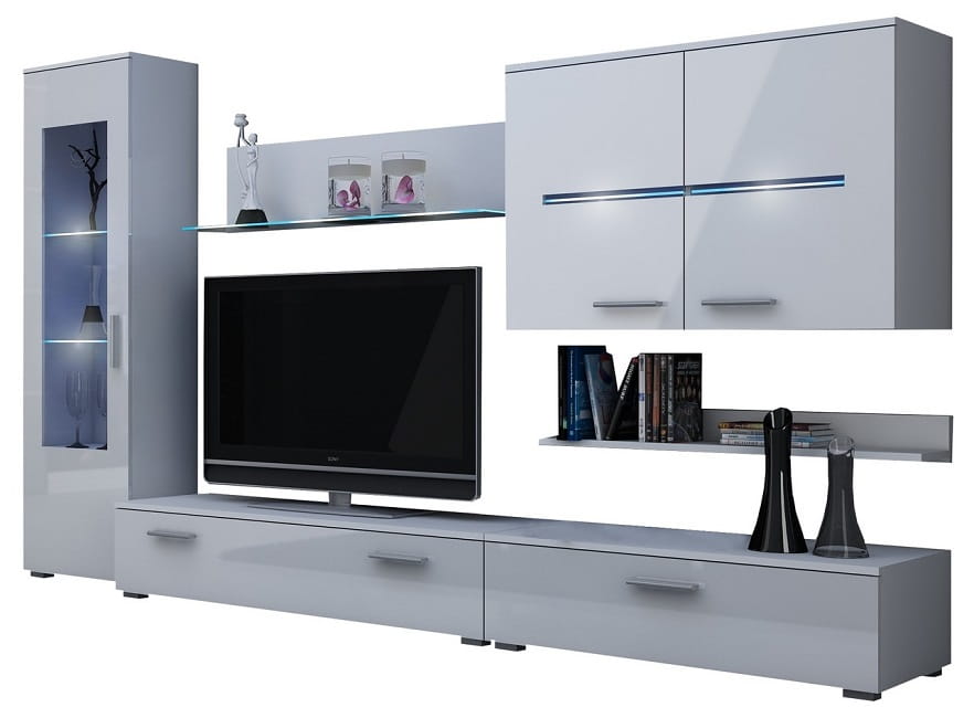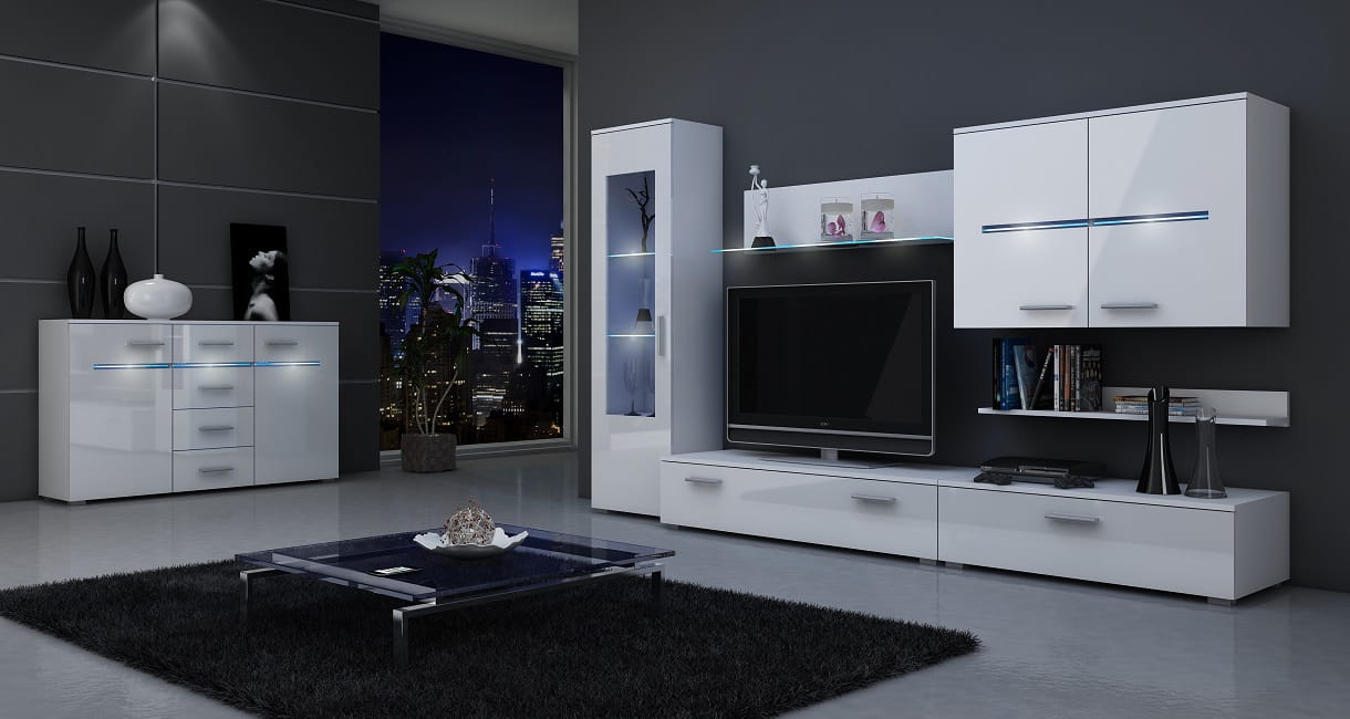 Nowoczesna meblościanka STUTTGART w zestawie z przeszkloną witryną.
