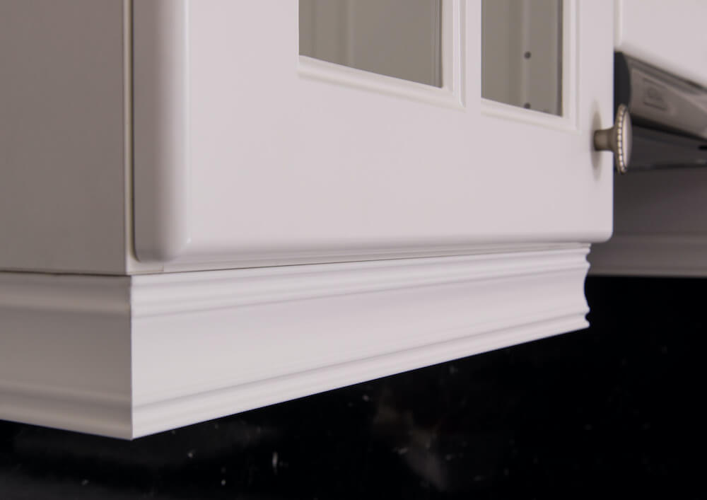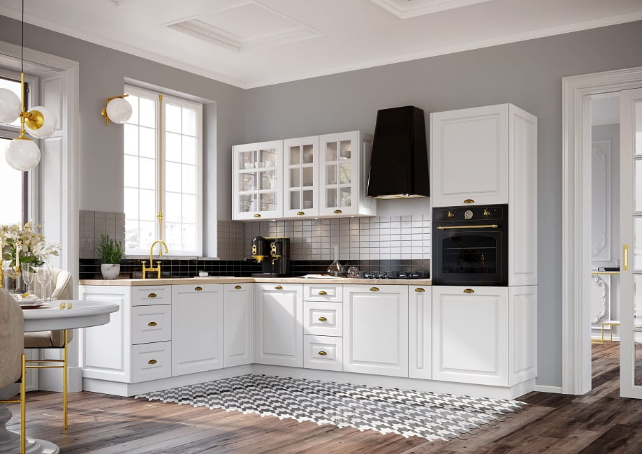Serce zestawu mebli kuchennych Alina Folia tworzą fronty – delikatnie frezowane w kształt prostokąta, wykonane z foliowanej płyty MDF o grubości 19 mm. Dostępne są w kilku wersjach kolorystycznych – absolutnie czystej lub delikatnie złamanej szarością bieli, a także mlecznej kawy, popiołu i głębokiej czerni. Zestawiać je można z blatami – inspirowanymi naturalnym drewnem – orzechem bądź dębem, skałami – marmurem i trawertynem, metalami, a nawet betonem… Ich uzupełnieniem są elementy dekoracyjne – frezowane listwy zwieńczające szafki górne od dołu i góry, proponowane oddzielnie uchwyty w formie złotych gałek, a także inne dekoracyjne elementy, które wieńczyć mogą korpusy szafek na skraju zabudowy.
