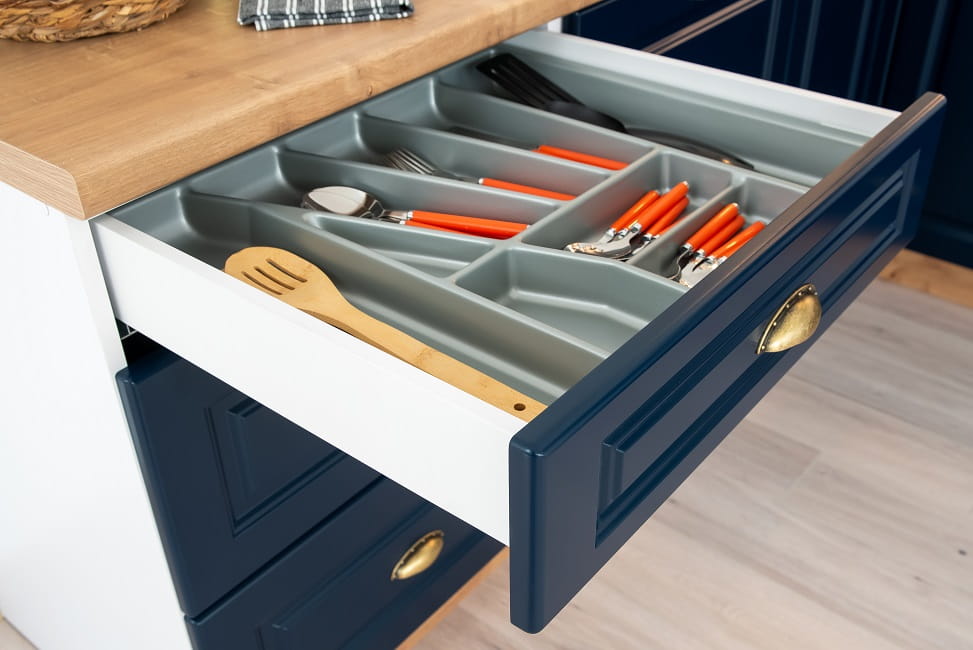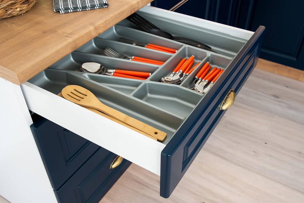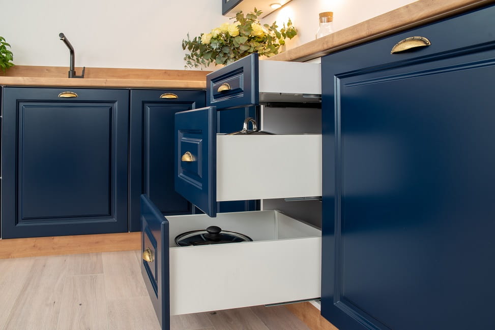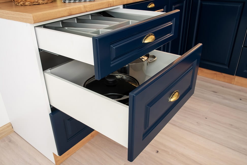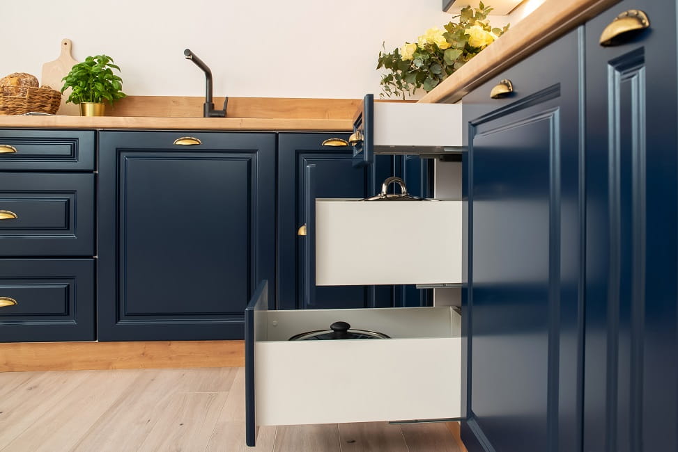 - Szuflady wyposażone w system cichego zamykania z pełnym wysuwem
