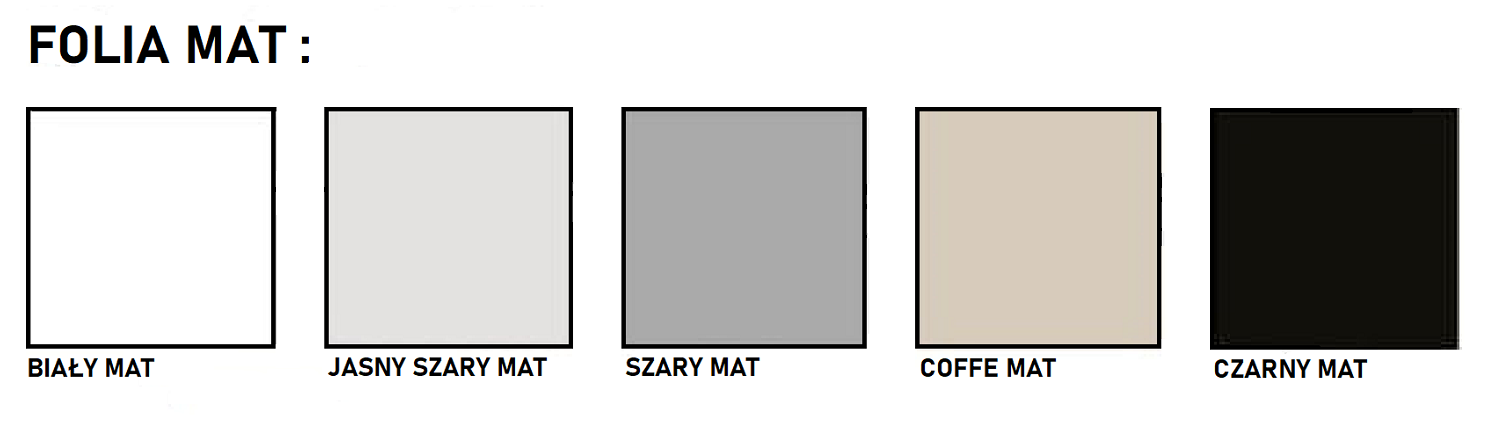 - Fronty wykonane z płyty MDF 19mm, dostępne są w 11 wersjach kolorystycznych - matowa powierzchnia, brak “śladów palców” na frontach oraz w 8 wersjach kolorystycznych na wysoki połysk