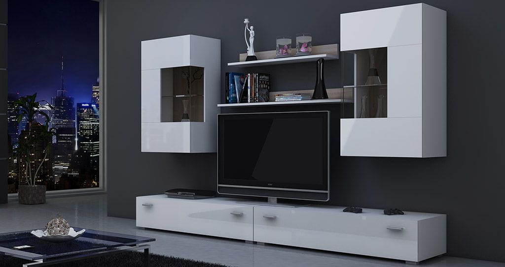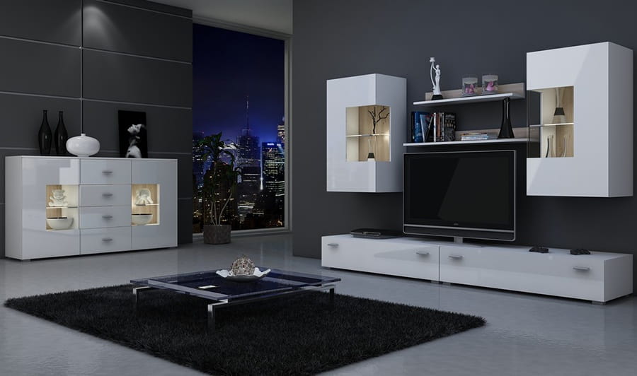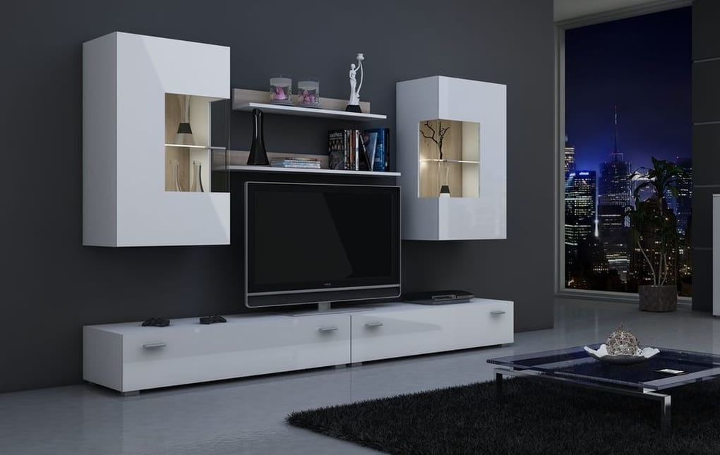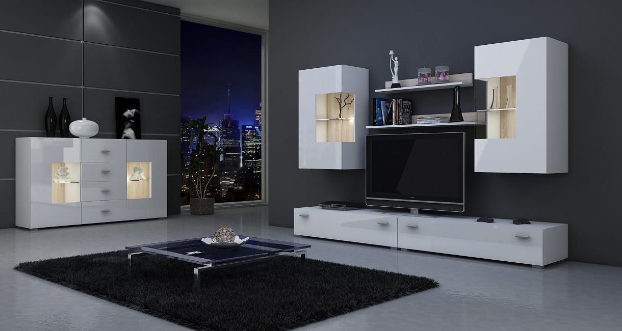 Zestaw mebli do salonu składa się z pojemnych stolików na sprzęt i akcesoria RTV, na których można także umieścić duży telewizor, wiszących witryn z nowoczesnymi przeszkleniami oraz dwóch półek wiszących – idealne miejsce na drobne dzieła sztuki lub rodzinne zdjęcia. Meblościanka Berlin z oświetleniem pasuje do nowoczesnych aranżacji.
