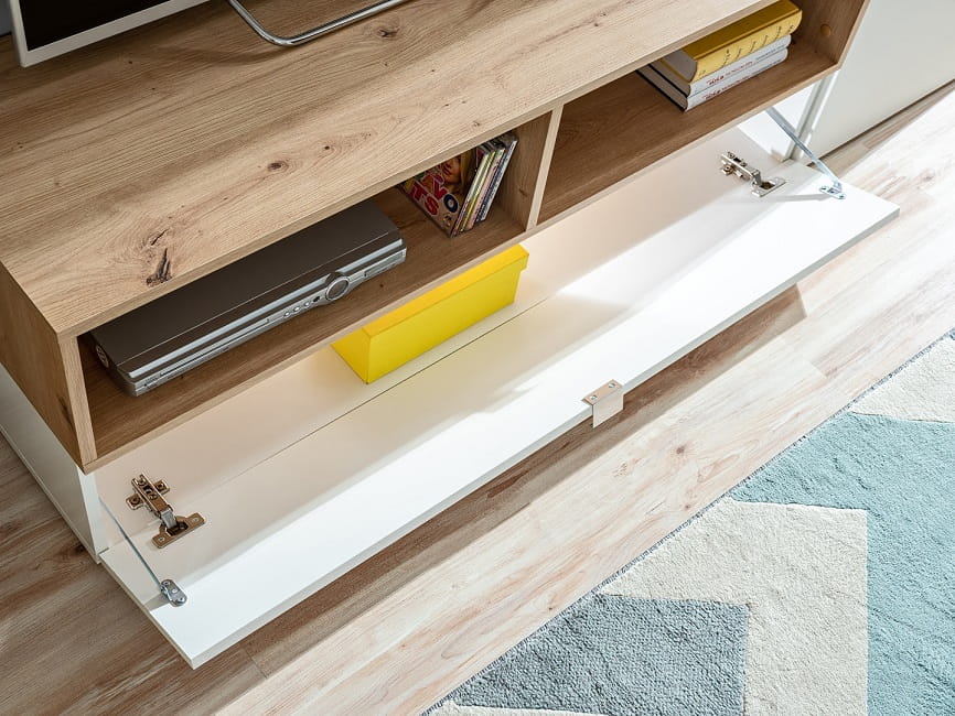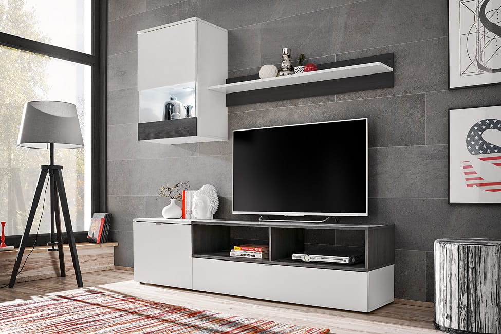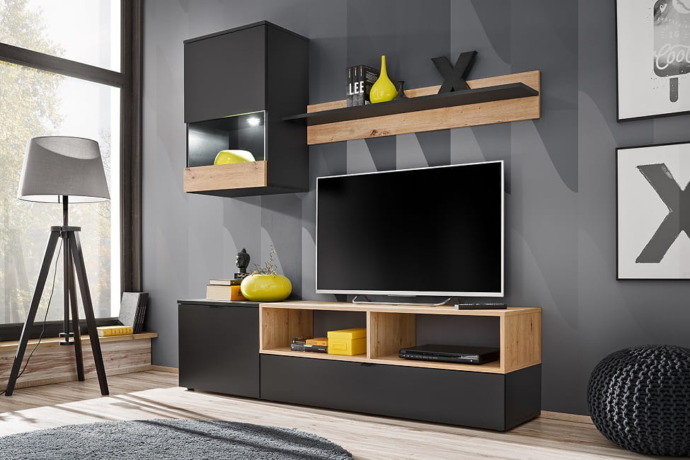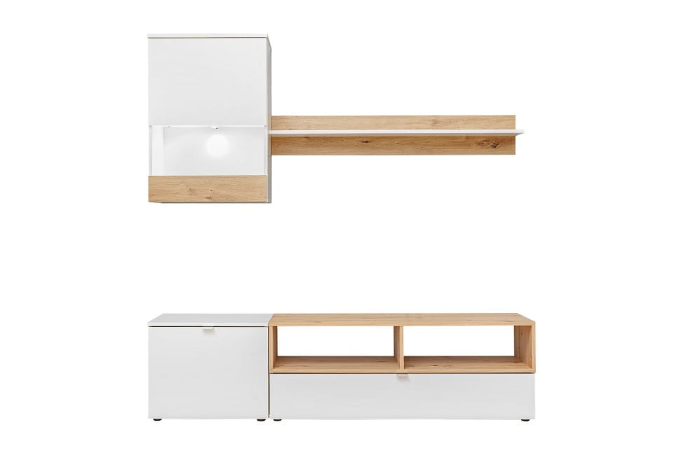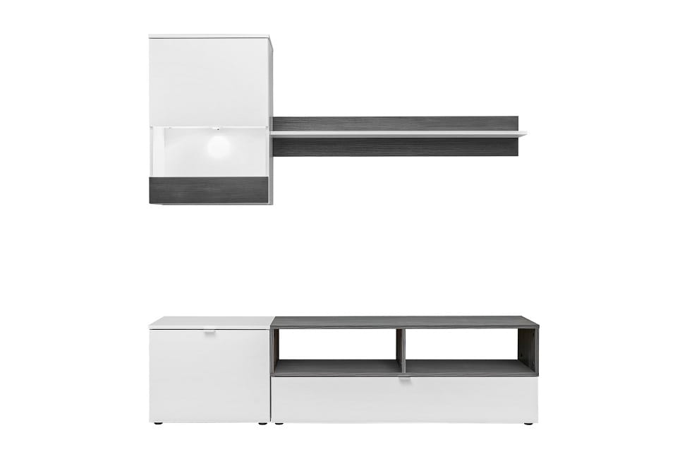 Meblościanka BREMEN stanowi propozycję dla małych wnętrz. Ta meblościanka doskonale wypełni przestrzeń. Kolorystyka dopełniona oświetleniem led wpisuje się w najnowsze wnętrzarskie trendy.