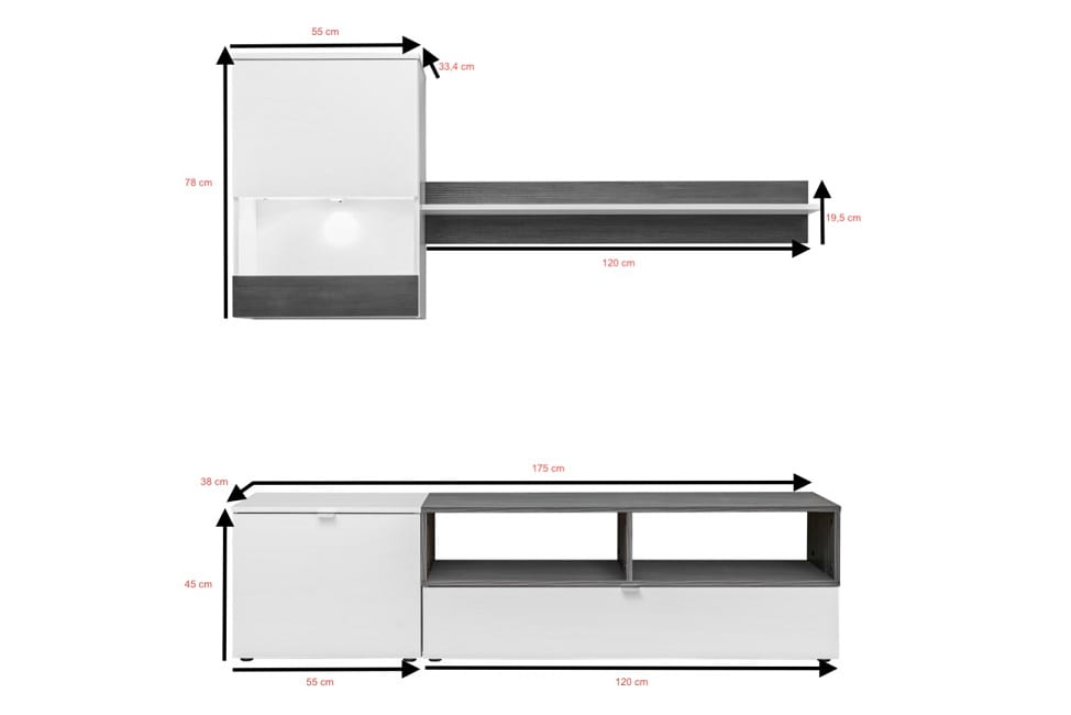 Wymiary prezentowanego zestawu to 175 cm szerokości, 38 głębokości oraz regulowana wysokość zależna od zawieszenia witryny i półki.