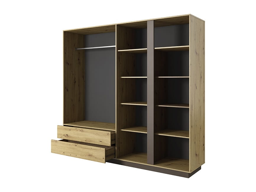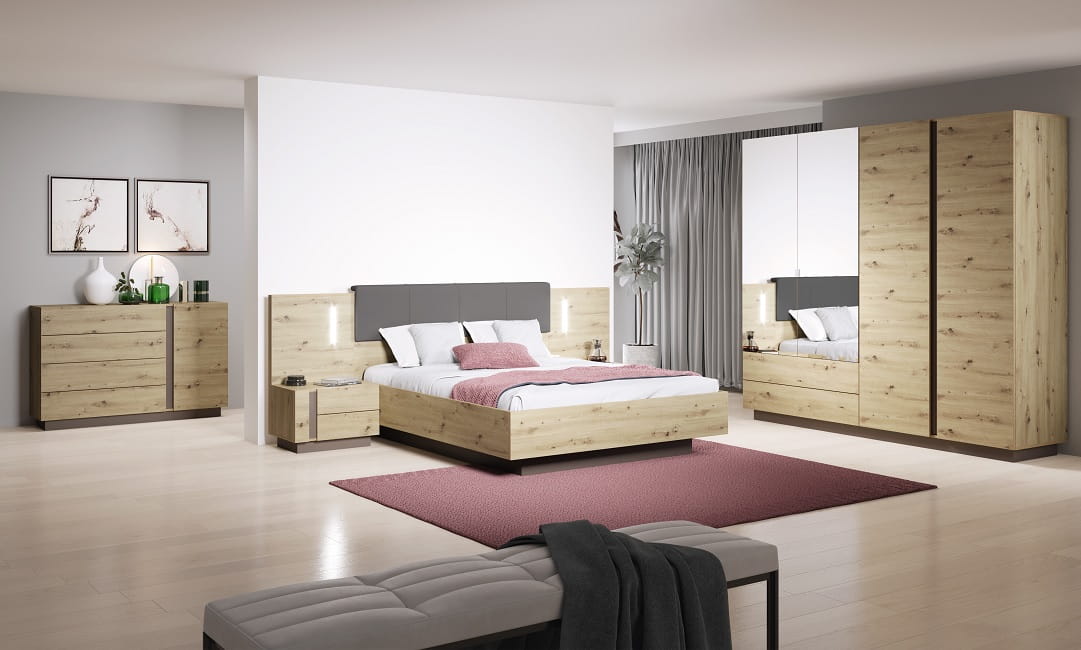 Kolekcja zaprojektowana, aby sprostać wymaganiom wielu użytkowników - pojemna szafa z dużymi lustrami, praktyczna komoda oraz łóżko z pojemnikiem na pościel. Wszystko, czego potrzeba - praktyczne i funkcjonalne.