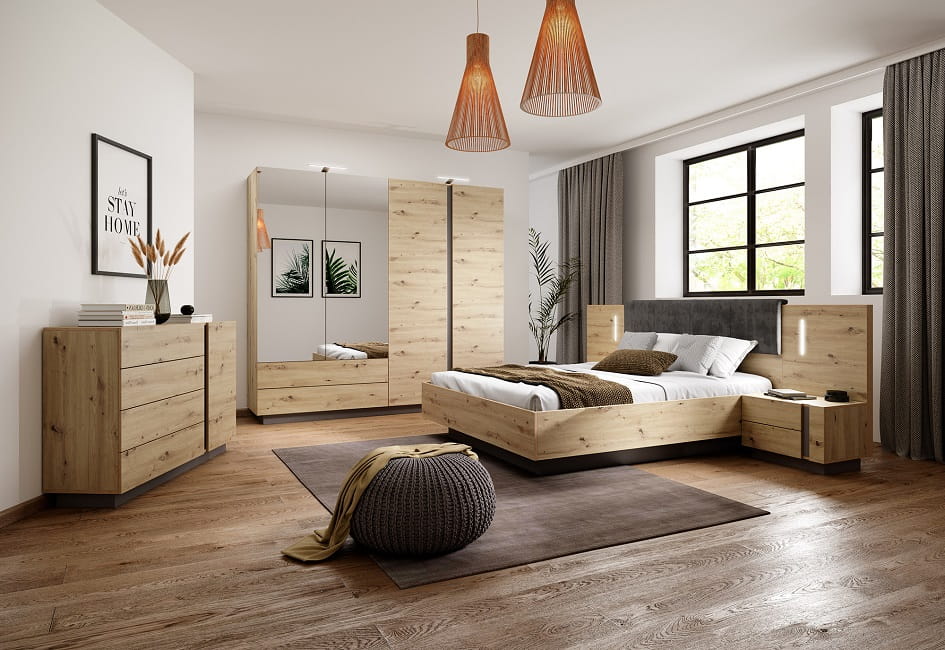 Marzy Ci się bliskość natury w sypialni? Idealnym wyborem będzie kolekcja ARCO. Kontrastowe zestawienie kolorystyczne pięknego, naturalnego dębu i ciemnego, szarego grafitu.