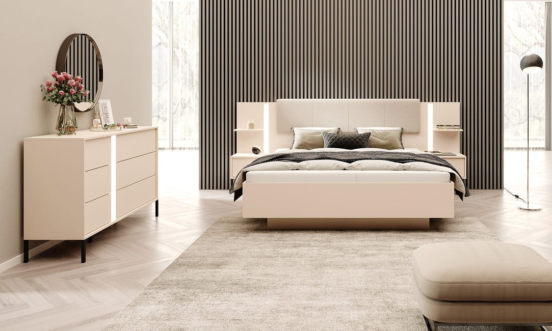 Zestaw DAST do sypialni zdobędzie Twoje serce dzięki prostym, bezuchwytowym bryłom i subtelnej, beżowej kolorystyce, dopełnionej oryginalnymi, pionowymi podświetleniami LED.