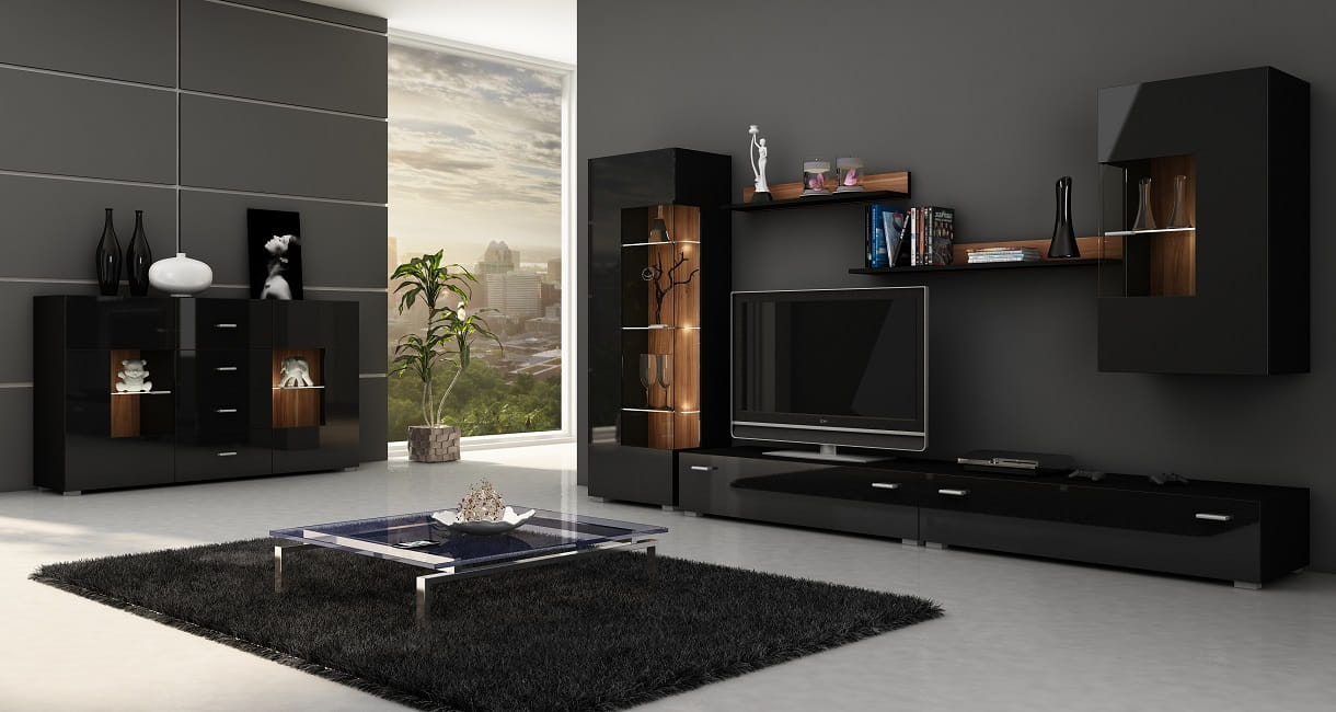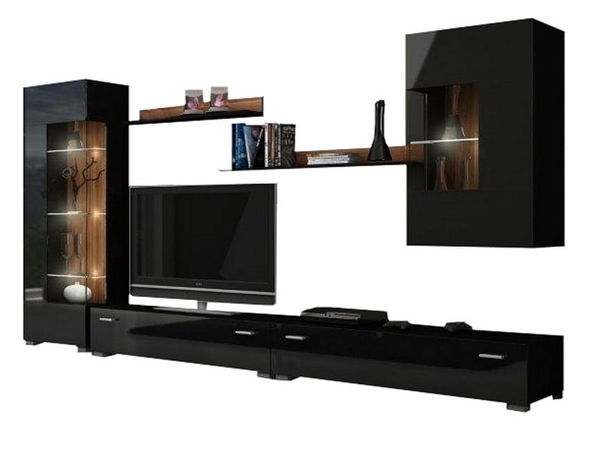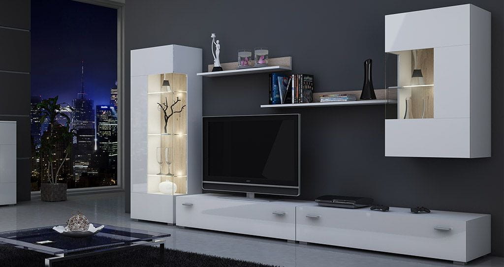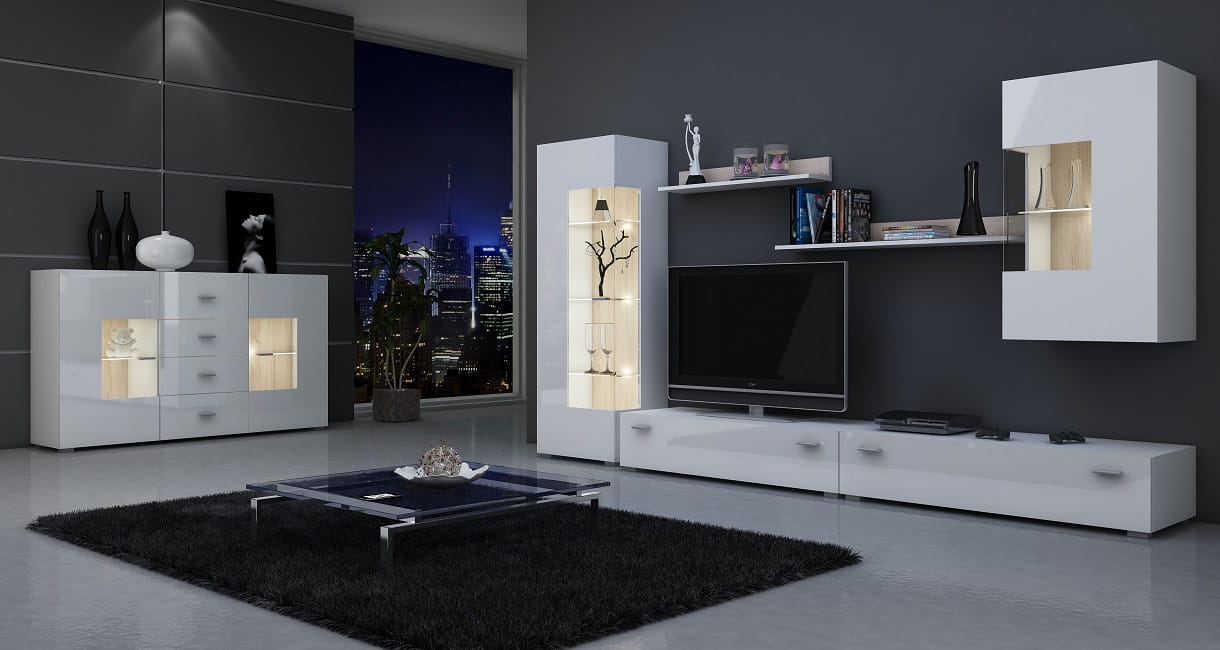 Nowoczesna meblościanka HAMBURG w zestawie z przeszkloną witryną.