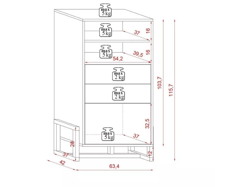 - KOMODA: szerokość 63,5cm, głębokość 42cm, wysokość (z nogami) 116 cm