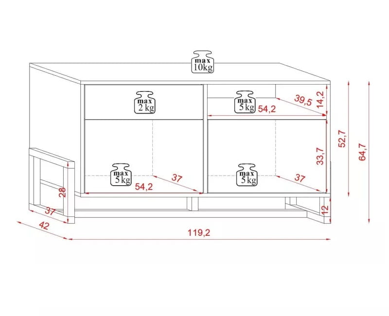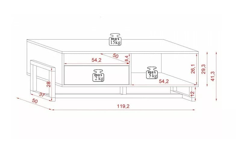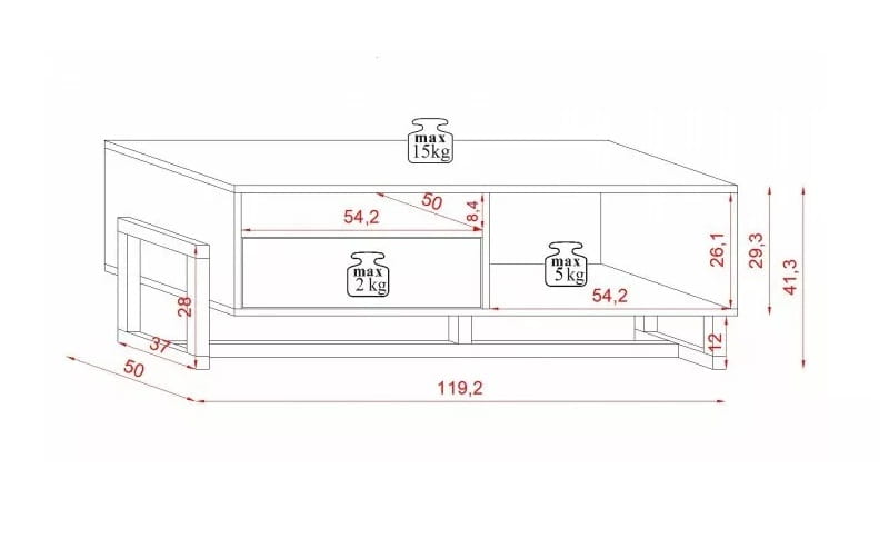 - STOLIK KAWOWY: szerokość 119,2cm, głębokość 50cm, wysokość (z nogami) 41,3cm