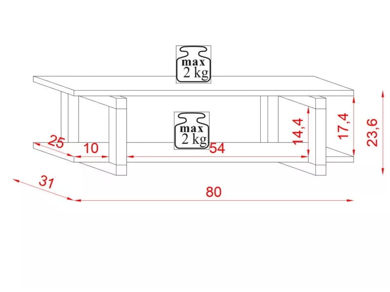 - PÓŁKA: szerokość 80cm, głębokość 31cm, wysokość (z nogami) 23,5cm