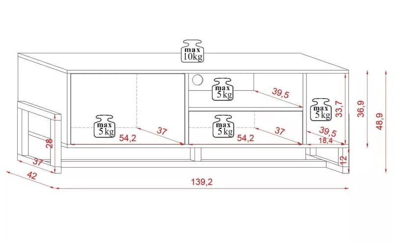 - SZAFKA RTV: szerokość 139,2cm, głębokość 42cm, wysokość (z nogami) 49cm
