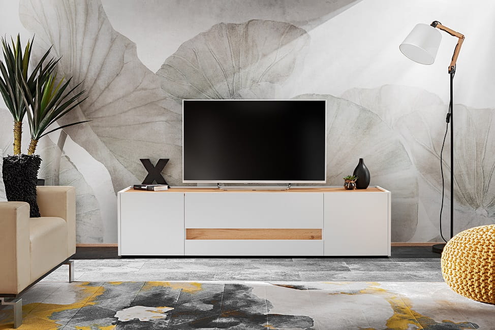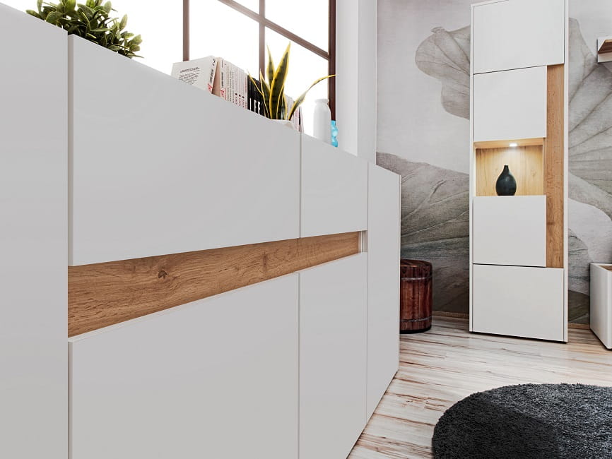Oferowany zestaw to część rozbudowanego systemu VIVA. Różnorodność brył oraz setów w systemie, pozwoli dowolnie zaaranżować każdą przestrzeń. System VIVA oferuje dwie wersje kolorystyczne – biały mat/dąb wotan oraz antracyt mat/dąb wotan.Mebel idealnie wpasuje się w każdą aranżacje wnętrz.