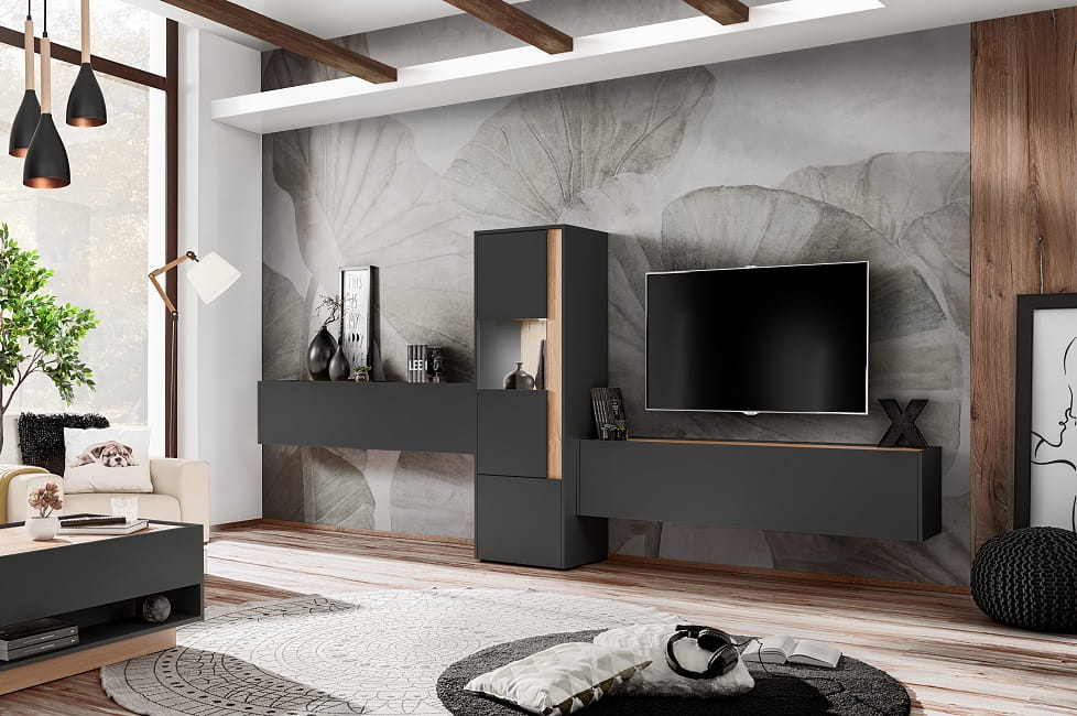 Oferowany zestaw to część rozbudowanego systemu VIVA. Różnorodność brył oraz setów w systemie, pozwoli dowolnie zaaranżować każdą przestrzeń. System VIVA oferuje dwie wersje kolorystyczne – biały mat/dąb wotan oraz antracyt mat/dąb wotan.Mebel idealnie wpasuje się w każdą aranżacje wnętrz.